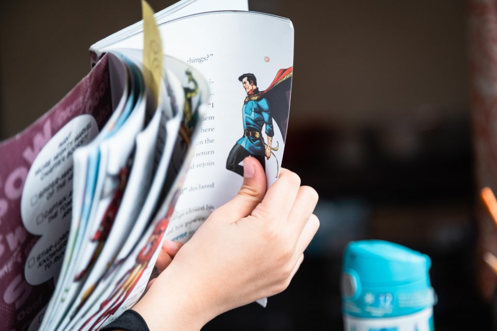 For the first part of the day, Skyler focuses on English Language Arts. He watches an instructional video from his teacher before reading independently for 20 minutes. His current book of choice is the brightly illustrated “Doctor Strange: Mystery of the Dark Magic.” Linda helps sound out words and guides him through reading assignments that range from annotating key passages in the story with sticky notes to writing plot summaries to recording videos where he describes the book.