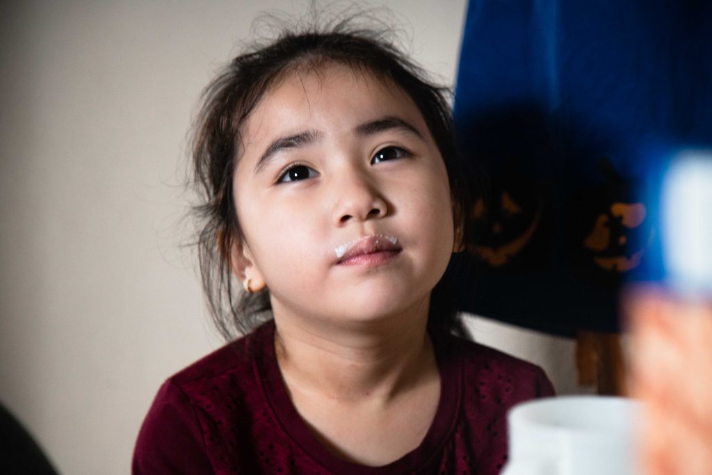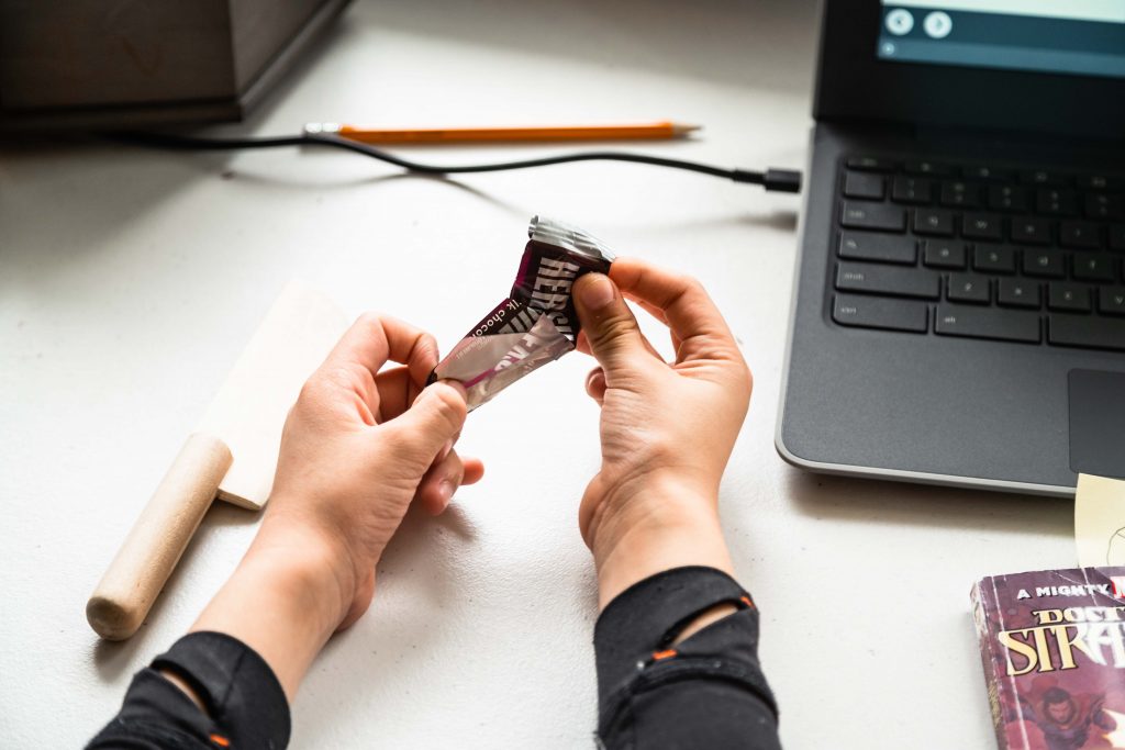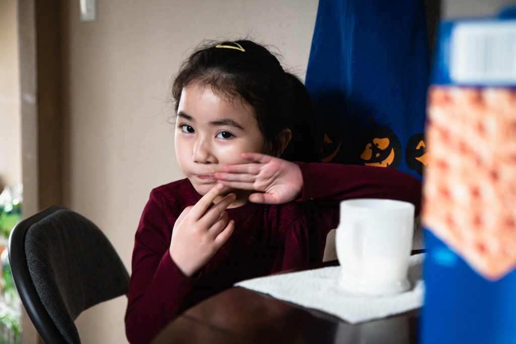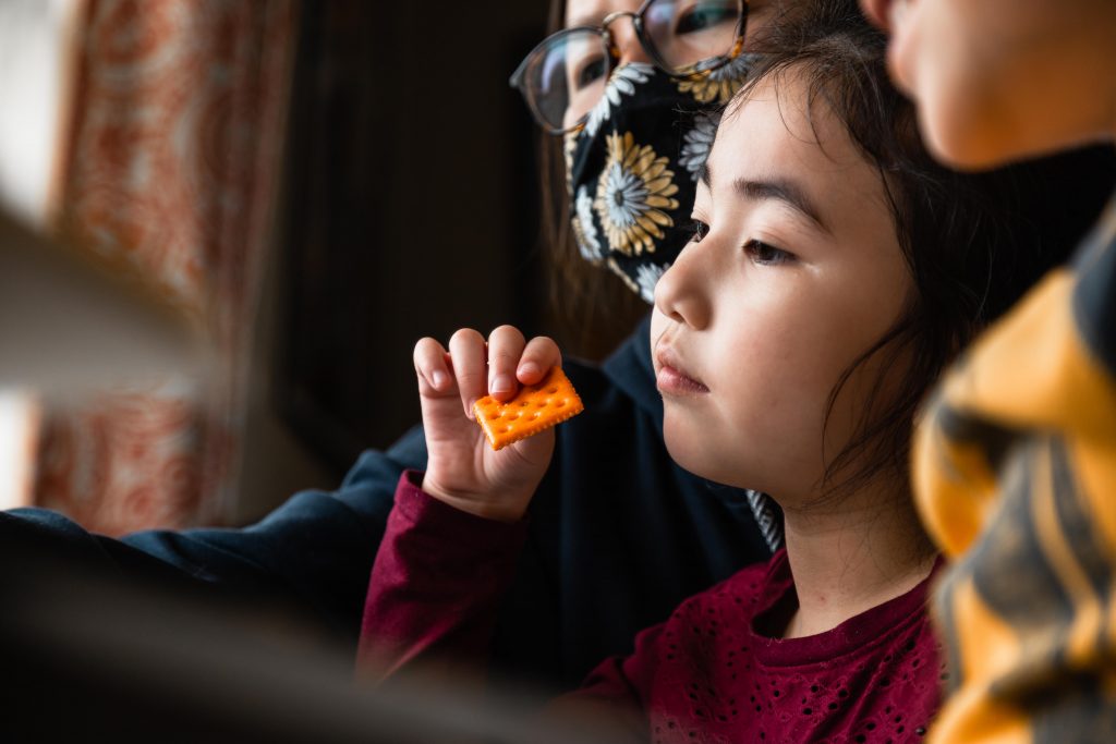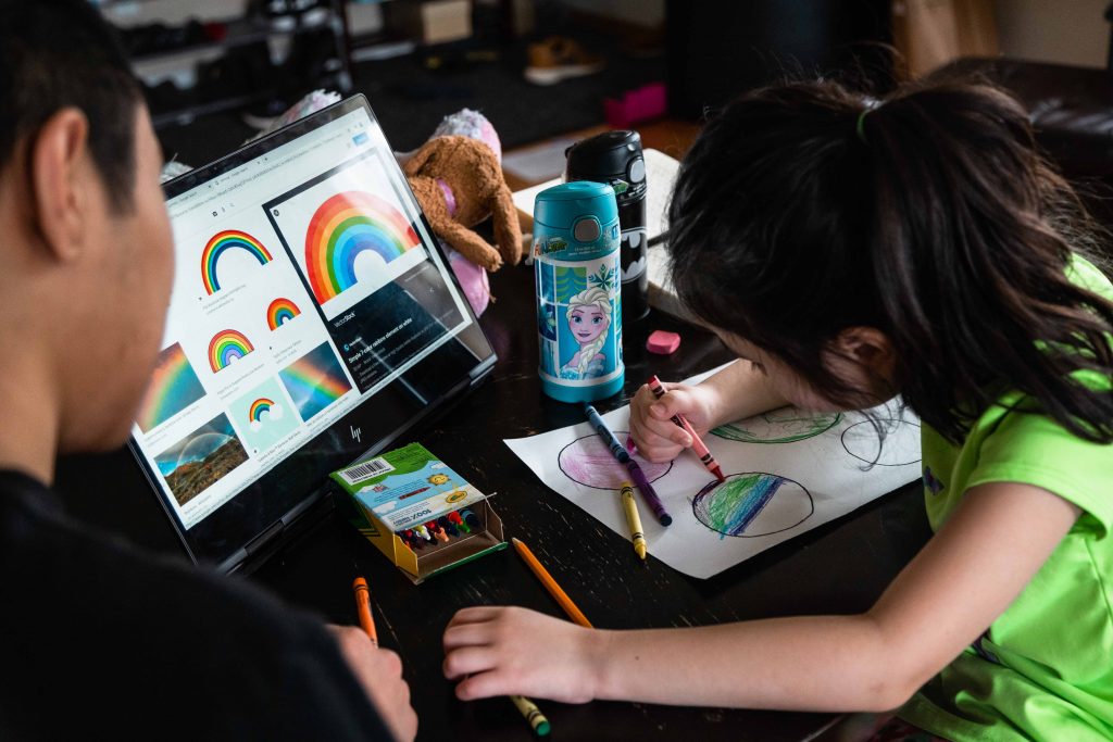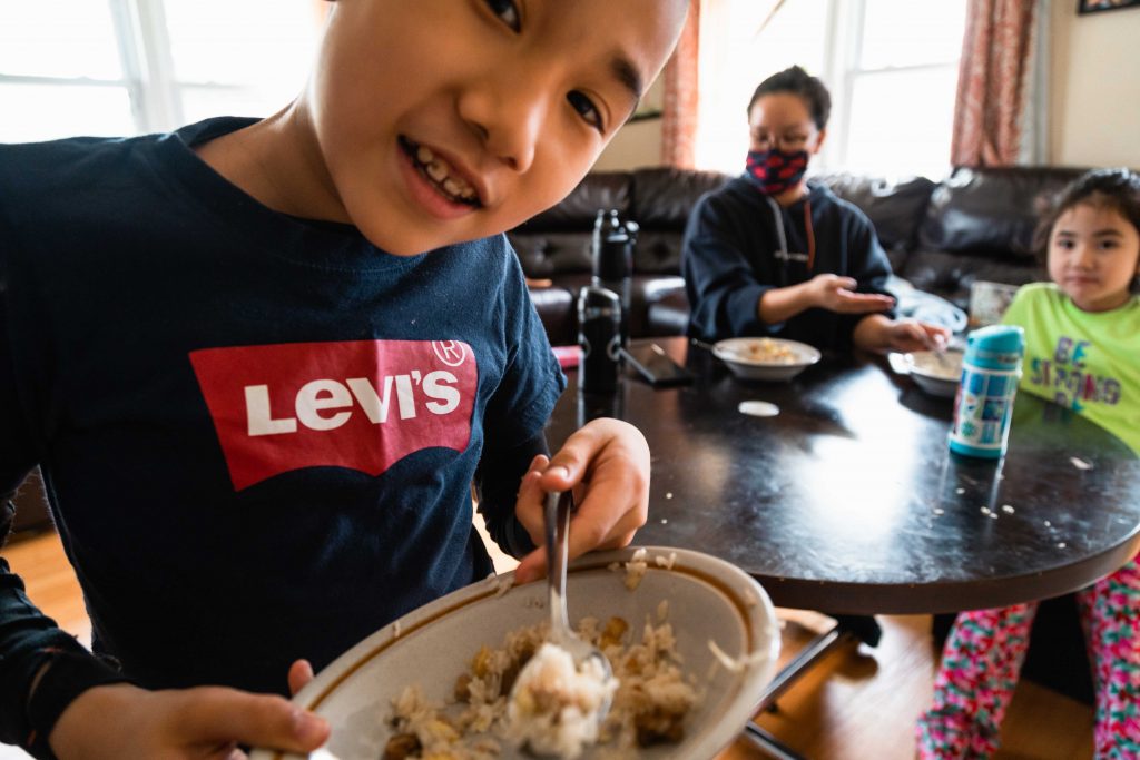 Despite the pandemic upending virtually all aspects of the school day, the kids’ appetite and excitement for lunchtime has not changed. As noon approaches, they become increasingly less focused and silly. Throughout the day, the kids repeatedly ask when they get to eat, as if their constant questioning will make the clock skip ahead to lunchtime. For Skyler and Sofia, being at home has its benefits: they raid the refrigerator and cabinets for snacks whenever they want. It is not an uncommon sight to see Sofia stuffing her face with puffy marshmallows or Skyler playing with a crinkled candy wrapper as he works.