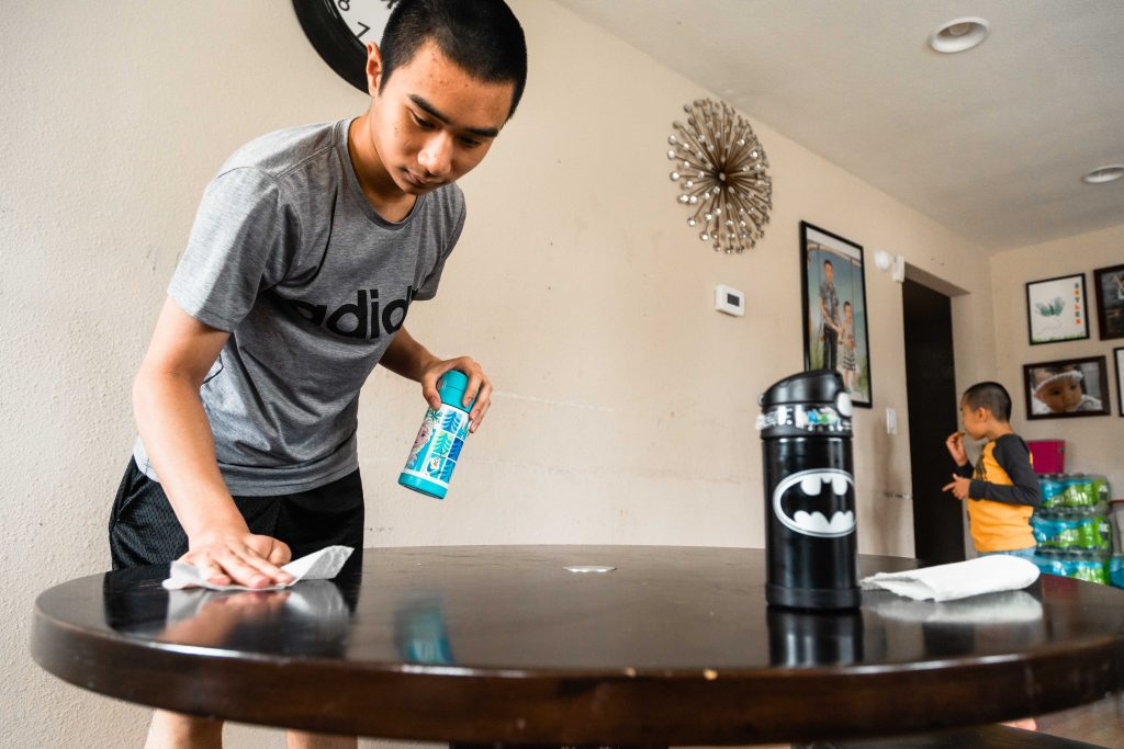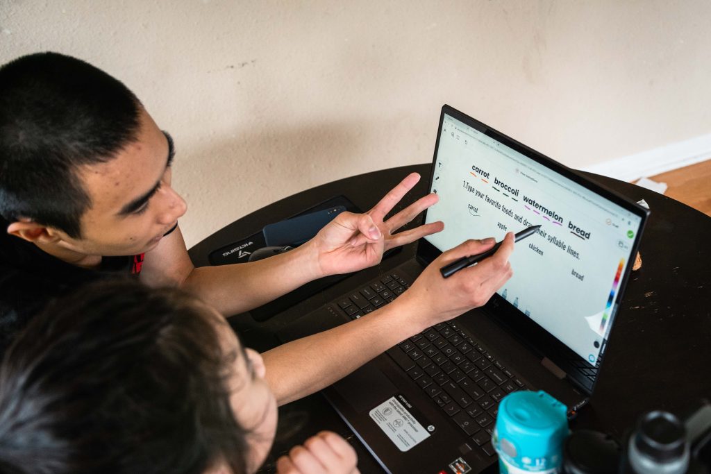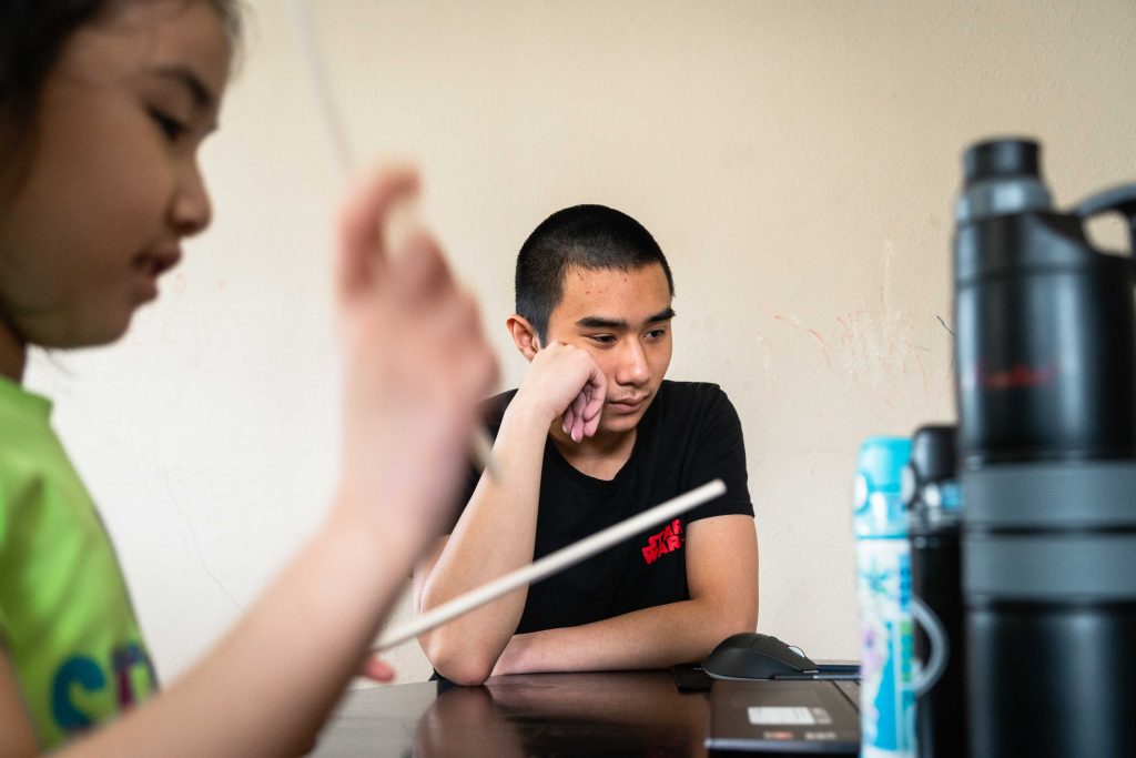 Sofia finally gets her turn in the virtual classroom when Vanchhoeng finishes his classes for the day at around 2:30 p.m. At 15, he looks like the prototypical high school freshman — lanky and bright-eyed with a touch of acne he is well aware of. Sofia’s desk sits adjacent to Skyler’s. It’s the same wooden table where they eat lunch. He removes the remnants of their food with a Clorox wipe before setting down his new touch-screen laptop to start her lessons.