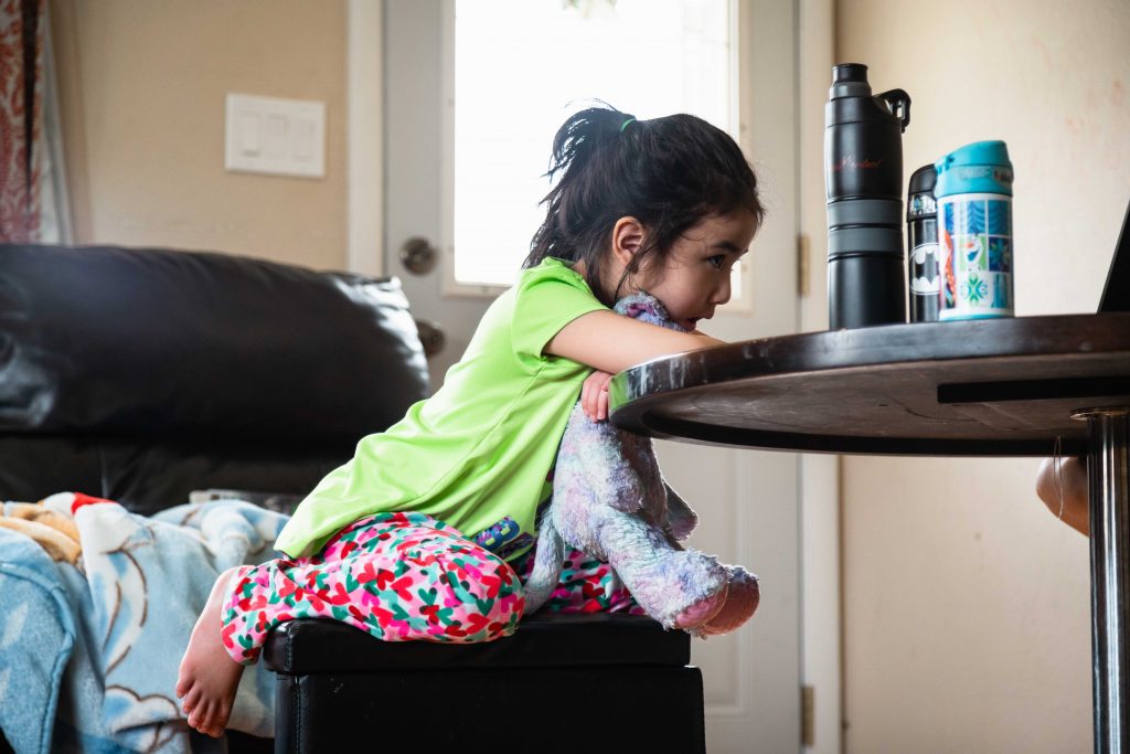 In the morning, she guides Skyler through virtual third grade using Google Classroom. Sofia is in kindergarten but has to wait to learn until her uncle is done working through his own virtual schooling for the day.