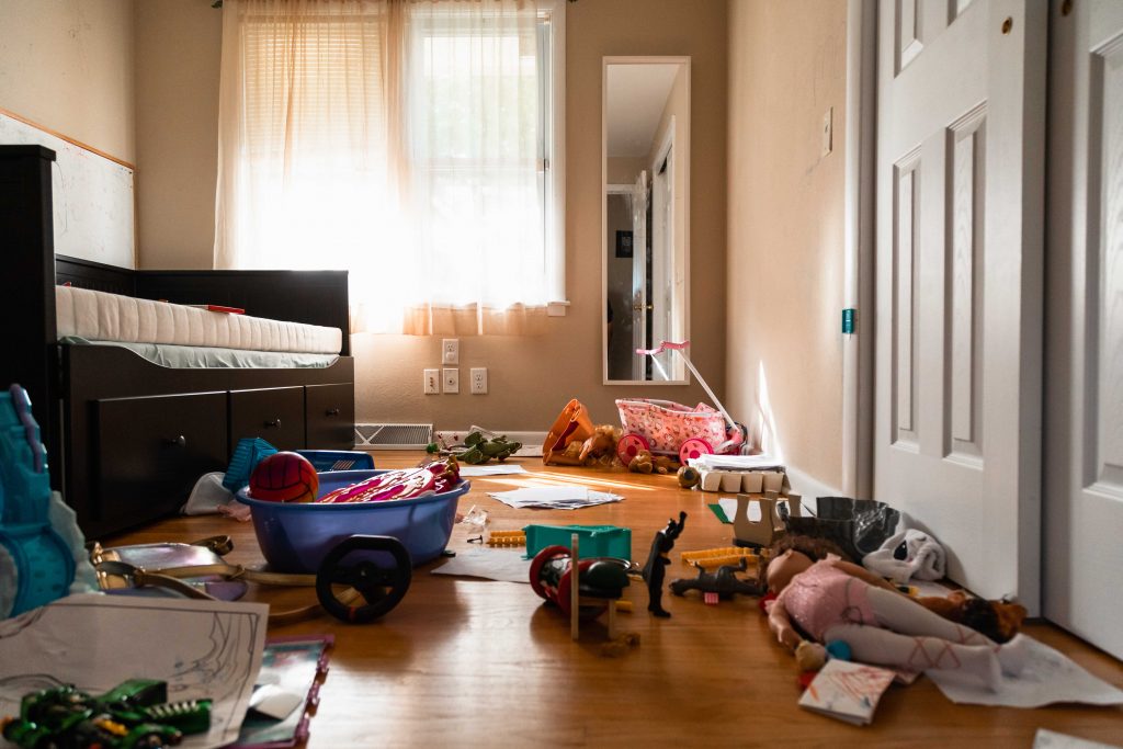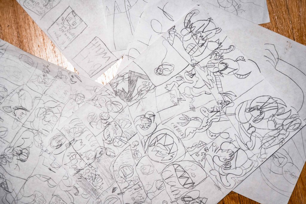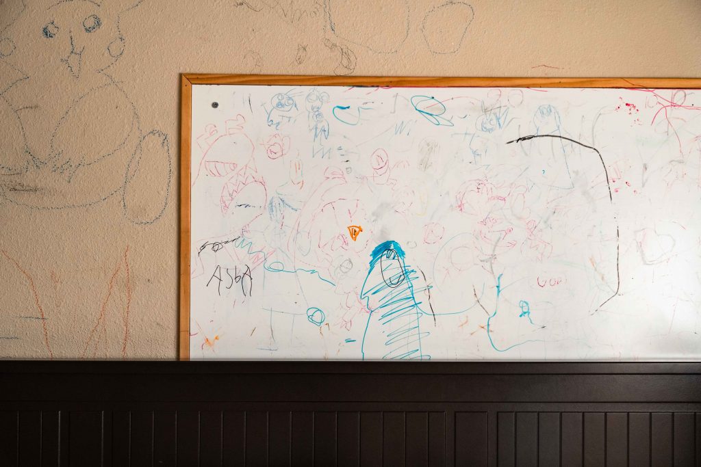 When they’re done for the day, the kids head to the playroom littered with years of birthday and Christmas presents. The multicolored scribbles on the walls offer a glimpse into Skyler’s mind. They were his sketchbook before he started making his own comics. The kids pass the time playing until their mom comes home.